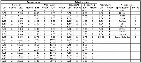 1. Set lensa coba ini dilengkapi dengan 266 buah lensa coba, semua kekuatan dalam 2 buah (1 pasang),